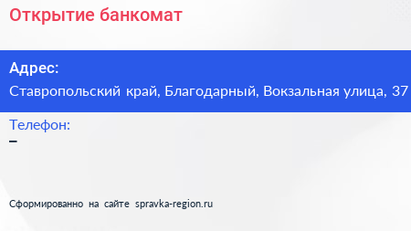 Открытие, банкомат по адресу Ставропольский край, Благодарный, Вокзальная улица, 37 в дальнейшем Организация, размещена в следующих категориях: