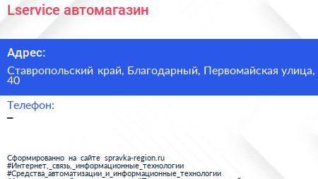 Lservice, автомагазин по адресу Ставропольский край, Благодарный, Первомайская улица, 40 в дальнейшем Организация, размещена в следующих категориях: