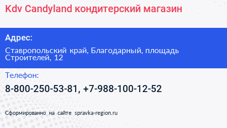 Kdv Candyland, кондитерский магазин по адресу Ставропольский край, Благодарный, площадь Строителей, 12 в дальнейшем Организация, размещена в следующих категориях:
