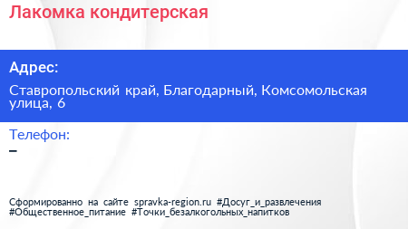 Лакомка, кондитерская по адресу Ставропольский край, Благодарный, Комсомольская улица, 6 в дальнейшем Организация, размещена в следующих категориях: