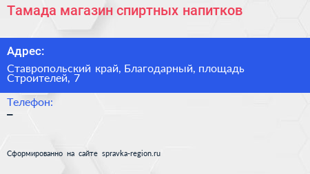 Тамада, магазин спиртных напитков по адресу Ставропольский край, Благодарный, площадь Строителей, 7 в дальнейшем Организация, размещена в следующих категориях:
