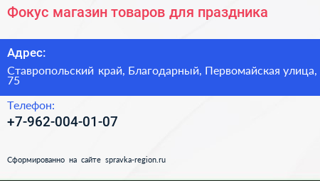 Фокус, магазин товаров для праздника по адресу Ставропольский край, Благодарный, Первомайская улица, 75 в дальнейшем Организация, размещена в следующих категориях:
