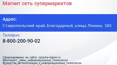Магнит, сеть супермаркетов по адресу Ставропольский край, Благодарный, улица Ленина, 185 в дальнейшем Организация, размещена в следующих категориях: