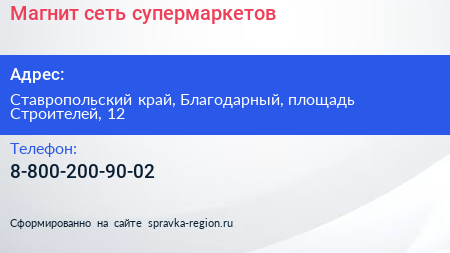 Магнит, сеть супермаркетов по адресу Ставропольский край, Благодарный, площадь Строителей, 12 в дальнейшем Организация, размещена в следующих категориях: