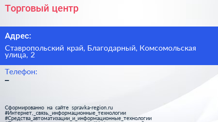Торговый центр по адресу Ставропольский край, Благодарный, Комсомольская улица, 2 в дальнейшем Организация, размещена в следующих категориях: