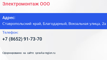 Электромонтаж, ООО по адресу Ставропольский край, Благодарный, Вокзальная улица, 2а в дальнейшем Организация, размещена в следующих категориях: