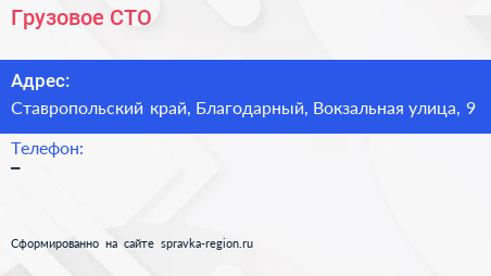 Грузовое СТО по адресу Ставропольский край, Благодарный, Вокзальная улица, 9 в дальнейшем Организация, размещена в следующих категориях:
