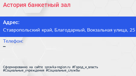 Астория, банкетный зал по адресу Ставропольский край, Благодарный, Вокзальная улица, 25 в дальнейшем Организация, размещена в следующих категориях: