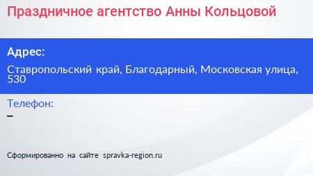 Праздничное агентство Анны Кольцовой по адресу Ставропольский край, Благодарный, Московская улица, 530 в дальнейшем Организация, размещена в следующих категориях: