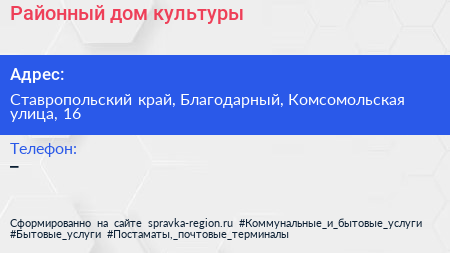 Районный дом культуры по адресу Ставропольский край, Благодарный, Комсомольская улица, 16 в дальнейшем Организация, размещена в следующих категориях: