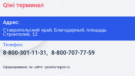 Qiwi, терминал по адресу Ставропольский край, Благодарный, площадь Строителей, 12 в дальнейшем Организация, размещена в следующих категориях: