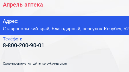 Апрель, аптека по адресу Ставропольский край, Благодарный, переулок Кочубея, 62 в дальнейшем Организация, размещена в следующих категориях: