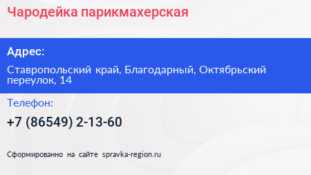 Чародейка, парикмахерская по адресу Ставропольский край, Благодарный, Октябрьский переулок, 14 в дальнейшем Организация, размещена в следующих категориях:
