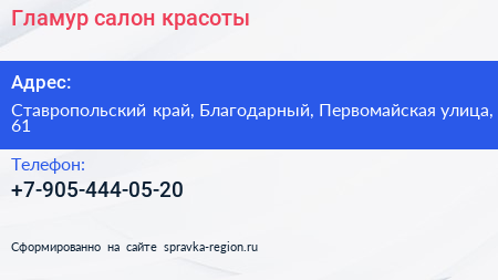 Гламур, салон красоты по адресу Ставропольский край, Благодарный, Первомайская улица, 61 в дальнейшем Организация, размещена в следующих категориях: