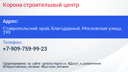 Корона, строительный центр по адресу Ставропольский край, Благодарный, Московская улица, 199 в дальнейшем Организация, размещена в следующих категориях: