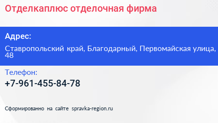 Отделкаплюс, отделочная фирма по адресу Ставропольский край, Благодарный, Первомайская улица, 48 в дальнейшем Организация, размещена в следующих категориях: