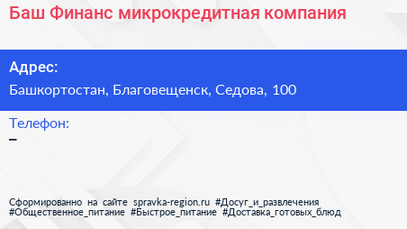 Баш Финанс, микрокредитная компания по адресу Башкортостан, Благовещенск, Седова, 100 в дальнейшем Организация, размещена в следующих категориях: