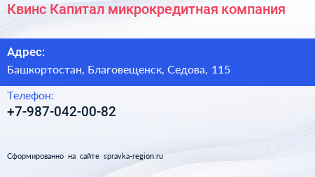 Квинс Капитал, микрокредитная компания по адресу Башкортостан, Благовещенск, Седова, 115 в дальнейшем Организация, размещена в следующих категориях: