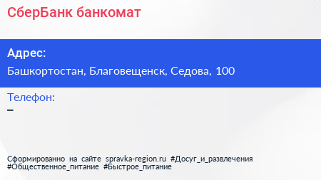 СберБанк, банкомат по адресу Башкортостан, Благовещенск, Седова, 100 в дальнейшем Организация, размещена в следующих категориях: