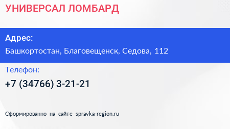 УНИВЕРСАЛ ЛОМБАРД по адресу Башкортостан, Благовещенск, Седова, 112 в дальнейшем Организация, размещена в следующих категориях: