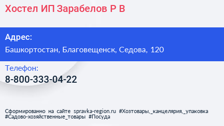 Хостел, ИП Зарабелов Р.В. по адресу Башкортостан, Благовещенск, Седова, 120 в дальнейшем Организация, размещена в следующих категориях: