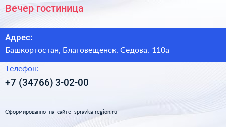 Вечер, гостиница по адресу Башкортостан, Благовещенск, Седова, 110а в дальнейшем Организация, размещена в следующих категориях: