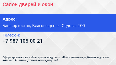Салон дверей и окон по адресу Башкортостан, Благовещенск, Седова, 100 в дальнейшем Организация, размещена в следующих категориях: