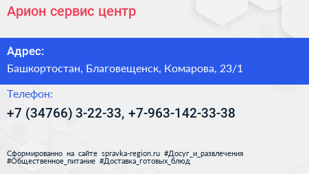 Арион, сервис-центр по адресу Башкортостан, Благовещенск, Комарова, 23/1 в дальнейшем Организация, размещена в следующих категориях: