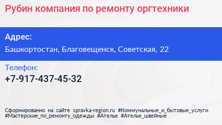 Рубин, компания по ремонту оргтехники по адресу Башкортостан, Благовещенск, Советская, 22 в дальнейшем Организация, размещена в следующих категориях: