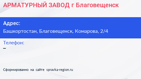 АРМАТУРНЫЙ ЗАВОД, г. Благовещенск по адресу Башкортостан, Благовещенск, Комарова, 2/4 в дальнейшем Организация, размещена в следующих категориях: