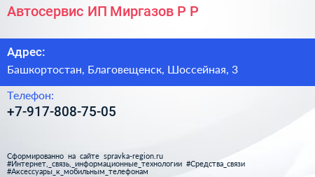 Автосервис, ИП Миргазов Р.Р. по адресу Башкортостан, Благовещенск, Шоссейная, 3 в дальнейшем Организация, размещена в следующих категориях: