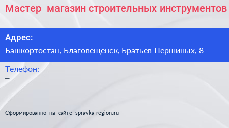 Мастер+, магазин строительных инструментов по адресу Башкортостан, Благовещенск, Братьев Першиных, 8 в дальнейшем Организация, размещена в следующих категориях: