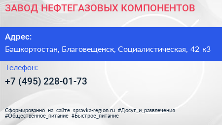 ЗАВОД НЕФТЕГАЗОВЫХ КОМПОНЕНТОВ по адресу Башкортостан, Благовещенск, Социалистическая, 42 к3 в дальнейшем Организация, размещена в следующих категориях: