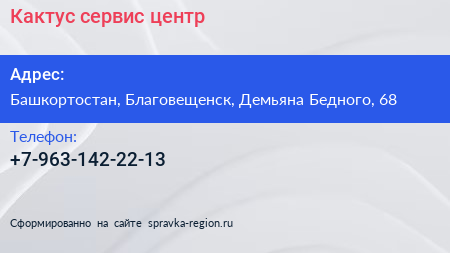 Кактус, сервис-центр по адресу Башкортостан, Благовещенск, Демьяна Бедного, 68 в дальнейшем Организация, размещена в следующих категориях:
