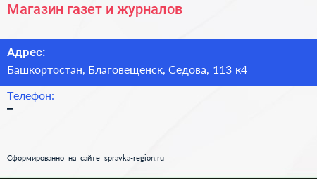 Магазин газет и журналов по адресу Башкортостан, Благовещенск, Седова, 113 к4 в дальнейшем Организация, размещена в следующих категориях: