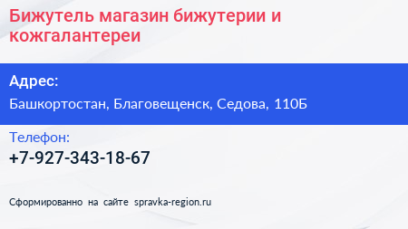 Бижутель, магазин бижутерии и кожгалантереи по адресу Башкортостан, Благовещенск, Седова, 110Б в дальнейшем Организация, размещена в следующих категориях: