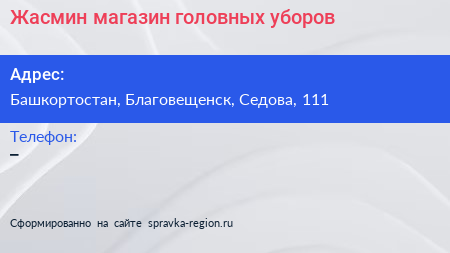 Жасмин, магазин головных уборов по адресу Башкортостан, Благовещенск, Седова, 111 в дальнейшем Организация, размещена в следующих категориях: