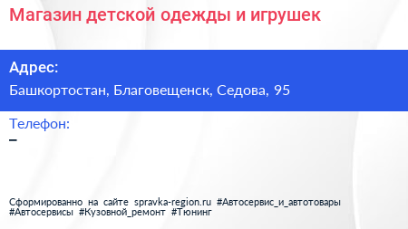 Магазин детской одежды и игрушек по адресу Башкортостан, Благовещенск, Седова, 95 в дальнейшем Организация, размещена в следующих категориях: