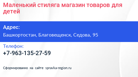 Маленький стиляга, магазин товаров для детей по адресу Башкортостан, Благовещенск, Седова, 95 в дальнейшем Организация, размещена в следующих категориях:
