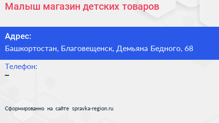 Малыш, магазин детских товаров по адресу Башкортостан, Благовещенск, Демьяна Бедного, 68 в дальнейшем Организация, размещена в следующих категориях:
