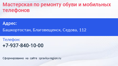 Мастерская по ремонту обуви и мобильных телефонов по адресу Башкортостан, Благовещенск, Седова, 112 в дальнейшем Организация, размещена в следующих категориях: