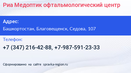 Риа-Медоптик, офтальмологический центр по адресу Башкортостан, Благовещенск, Седова, 107 в дальнейшем Организация, размещена в следующих категориях: