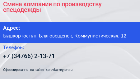 Смена, компания по производству спецодежды по адресу Башкортостан, Благовещенск, Коммунистическая, 12 в дальнейшем Организация, размещена в следующих категориях: