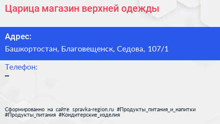 Царица, магазин верхней одежды по адресу Башкортостан, Благовещенск, Седова, 107/1 в дальнейшем Организация, размещена в следующих категориях: