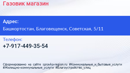 Газовик, магазин по адресу Башкортостан, Благовещенск, Советская, 5/11 в дальнейшем Организация, размещена в следующих категориях: