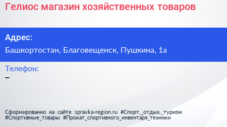 Гелиос, магазин хозяйственных товаров по адресу Башкортостан, Благовещенск, Пушкина, 1а в дальнейшем Организация, размещена в следующих категориях:
