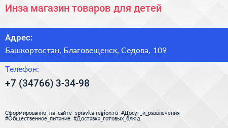 Инза, магазин товаров для детей по адресу Башкортостан, Благовещенск, Седова, 109 в дальнейшем Организация, размещена в следующих категориях: