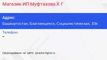 Магазин, ИП Муфтахова Х.Г. по адресу Башкортостан, Благовещенск, Социалистическая, 10в в дальнейшем Организация, размещена в следующих категориях: