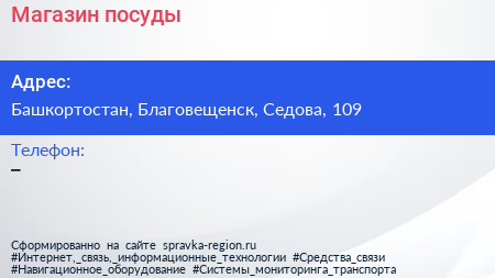 Магазин посуды по адресу Башкортостан, Благовещенск, Седова, 109 в дальнейшем Организация, размещена в следующих категориях: