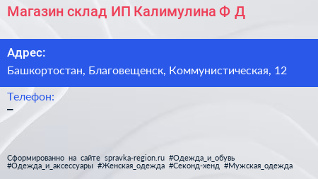 Магазин-склад, ИП Калимулина Ф.Д. по адресу Башкортостан, Благовещенск, Коммунистическая, 12 в дальнейшем Организация, размещена в следующих категориях: